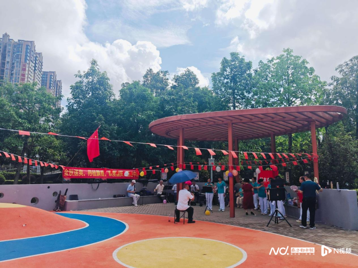 邻里亭暖,欢笑不断:修缮一新的凉亭成为社区文化小舞台,各民族居民在此唱歌、跳舞、交流乐器,每日洋溢着欢声笑语。