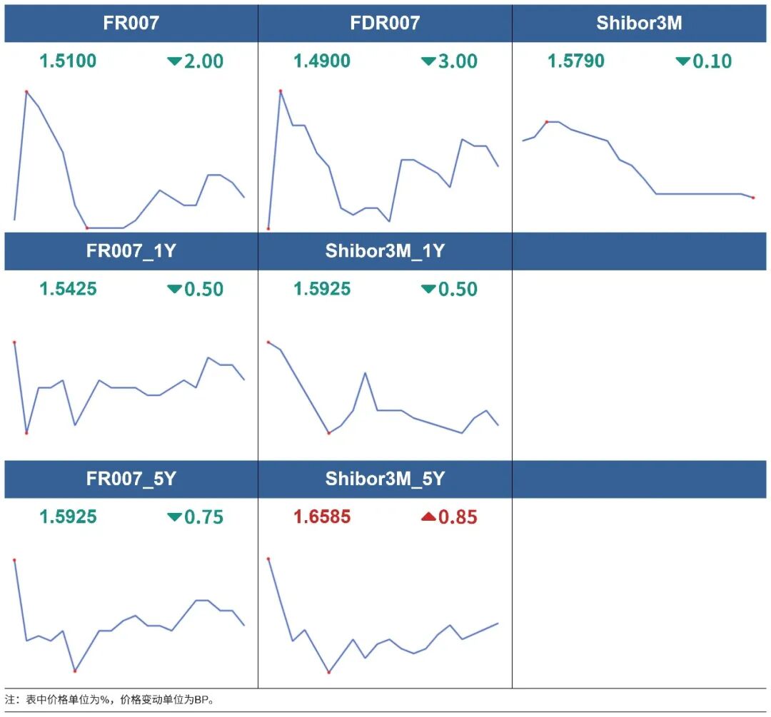 隔夜、1个月、3个月Shibor分别报1.364%、1.518%和1.579%,分别较前下行5.6BP、下行0.2BP和下行0.1BP。