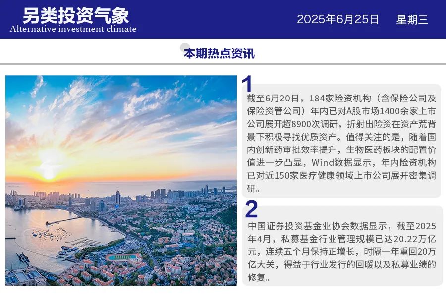 1. 截至6月20日,184家险资机构(含保险公司及保险资管公司)年内已对A股市场1400余家上市公司展开超8900次调研,折射出险资在资产荒背景下积极寻找优质资产。值得关注的是,随着国内创新药审批效率提升,生物医药板块的配置价值进一步凸显,Wind数据显示,年内险资机构已对近150家医疗健康领域上市公司展开密集调研。