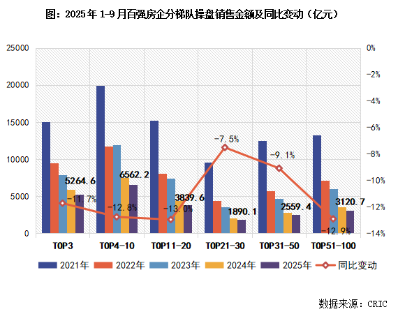 具体分梯队来看,2025年前9个月百强房企各梯队的操盘销售金额均在降低,TOP21-30和TOP31-50两个梯队房企的累计销售规模降幅相对较小,分别同比降低7.5%和9.1%,是唯二降幅在10%以内的梯队。