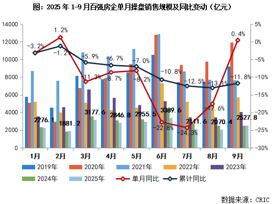 百强房企9月实现销售操盘金额2527.8亿元,环比增长22.1%,同比增长0.4%。