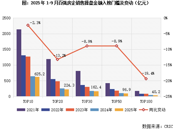 2025年9月,百强房企各梯队销售门槛较去年同期进一步降低,且门槛值均降至近年最低水平。其中,TOP10房企销售操盘金额门槛同比降低2.3%至625.2亿元。TOP30和TOP50房企门槛也分别同比降低8.9%至162.4亿元和96.9亿元。TOP100房企的销售操盘金额门槛更是降低了19.4%至40.2亿元。