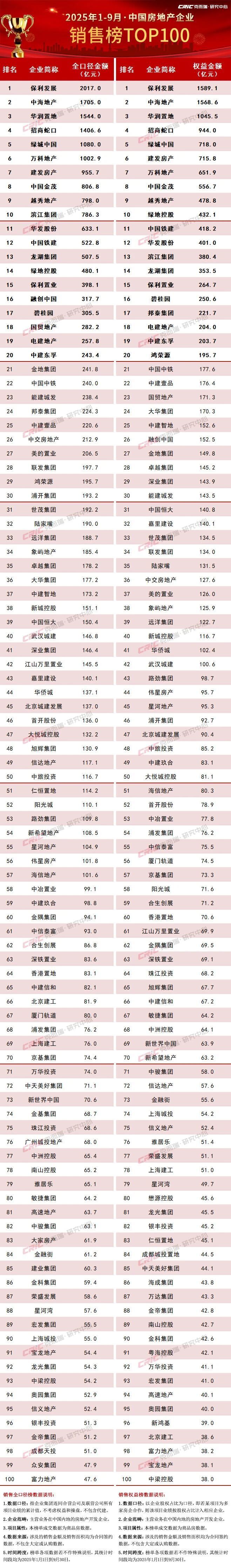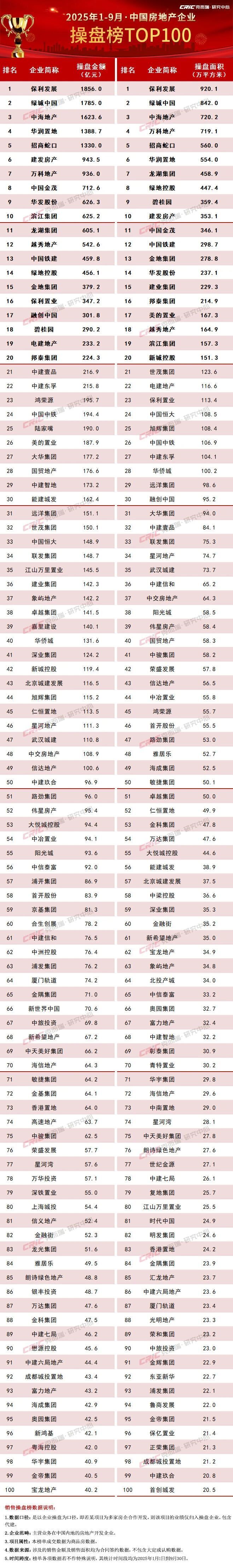 2025年9月,TOP100房企实现销售操盘金额2527.8亿元,环比增长22.1%,同比增长0.4%,虽然同比变动止跌回升,但是单月业绩规模整体仍处于历史较低水平。累计业绩来看,百强房企实现销售操盘金额23236.6亿元,同比降低11.8%,降幅收窄1.3个百分点。从企业表现来看,2025年9月有72家百强房企单月业绩环比增长,其中45家企业单月业绩环比增幅大于30%,包括华润置地、建发房产、中国铁建(601186)、电建地产、邦泰集团、中建东孚等,TOP10房企中有7家的销售操盘金额环比有所增长。