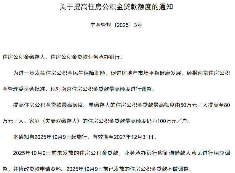 【大河财立方消息】10月9日股票配资在线公司,南京住房公积金管理中心发布《关于提高住房公积金贷款额度的通知》。